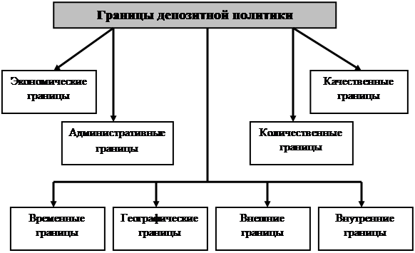Рисунок 2 – Принципы формирования депозитной политики коммерческого банка Одним из важных вопросов работы является вопрос о границах депозитной политики коммерческого банка, под которыми понимается определенный допустимый предел аккумулирования банком временно свободных денежных средств юридических и физических лиц. При этом дается классификация этих границ по следующим признакам: – в зависимости от спроса и предложения на рынке депозитов (экономические границы); – по воздействию нормативов ЦБ РФ и лимитов банка (административные границы); – в зависимости от субъектов депозитных отношений (внешние и внутренние границы); – в зависимости от срочности депозитных отношений (временные границы); – в зависимости от географического принципа (территориальные границы); – в зависимости от объемов и структуры привлеченных средств (количественные и качественные границы). В обобщенном виде классификация границ представлена на рисунке 3.