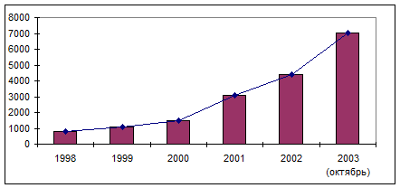 Рис. 3. Динамика РЭОК, рассчитанного относительно индекса потребительских цен и стоимости рабочей силы в 2003 г. Источник: [30; с. 12]. Международные резервы НБУ . Возрастание объемов международных валютных резервов НБУ, во-первых, увеличивает валютное обеспечение денежной базы (что повышает стабильность монетарной системы и национальной валюты), во-вторых, увеличивает возможности относительно погашения и обслуживания внешнего долга (что повышает международное доверие к государственной экономической политике и экономике Украины в целом), в-третьих, увеличивает возможности Национального банка относительно регулирования обменного курса и валютного рынка путем осуществления интервенций при временных колебаниях спроса и предложения (таблица 2.3). С начала 2000 г. по октябрь 2002 г. резервы НБУ возросли в 2.7 раза и достигают 4.2 млрд. долларов, а объемы чистых резервов за этот же период увеличились с -600 млн. к +2.2 млрд. долларов. Среднегодовое возрастание объемов резервов за период из 1998 г. по 2002 г. составляло 800 млн. долларов. На 01.11.2003 золотовалютные резервы составляли 7009 млрд. долл. США [30; с. 11]. Динамика международных резервов НБУ представлена на рис. 4. Таблица 2.3 Объемы валовых и чистых международных резервов НБУ.