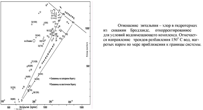 Для месторождения Бродландс имеются данные по содержанию NaCl и ОО2 и прямые измерения температур глубинных не кипевших первичных гидротерм. Здесь присутствуют относительно разбавленные хлоридные гидротермы, обогащённые углекислым конденсатом, с Т 150-2000 С на границе и над глубинными хлоридными гидротермами. Но даже без этой новой информации по включениям в минералах можно установить, что некоторые относительно холодные, но с низкими Tmгидротермы, были образованы путём разбавления. Относительно горячие гидротермы с более высоким Tmсвидетельствуют о кипении и газоотделении. Большие вариации Tm при небольших изменениях Th в некоторых образцах также позволяют предполагать циклические периоды кипения и газоотделения в результате изменения газовых концентраций. Пробы из скважин, попавшие на линию разбавления располагаются около границы системы Бродландс, где отмечается разбавление углекислым конденсатом. Остальные данные получены из продуктивных скважин, где отмечается кипение. Некоторое соответствие данных по скважинам 7 и 24 позволяет предполагать периодический подток глубинных, кипевших гидротерм к границе системы, возможно по трещинам. Аналогично, разбавленные гидротермы из скважины 8 в продуктивной зоне, показывают на периодический подток воды в зону хлоридных гидротерм. Причина, по которой график кипения отличается от того, что показано на Рис. 6, вызвана тем, что Tm, полученная по включениям в минералах, отражает минерализацию и содержание газов, тогда как диаграмма энтальпия-хлорид не учитывает газ. Следовательно, кипение вызывает увеличение хлорида в остаточной жидкости, в то же время оно значительно уменьшает содержание газа в жидкости. В системе с большим содержанием газа газоотделение в результате кипения будет преобладать над тенденцией увеличения содержания хлорида, в связи с чем, общее содержание растворимого вещества в гидротермах становится проблематичным. На Рис. 9 данные, совпадающие с расчётной кривой кипение-равновесие, показывают, что оба процесса имеют место.