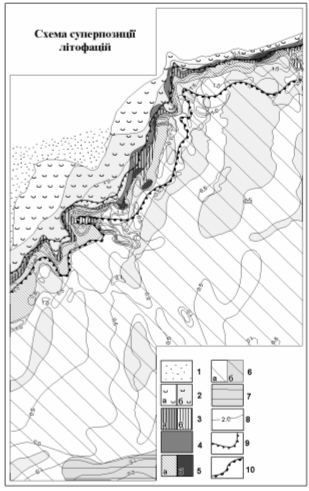 Литофация песковвыделяется только в северо-западной части Днестровско-Дунайского района внешнего шельфа. Пески очень мелкие со значительным количеством глинистого материала. В гранулометрическом составе песков фиксируется большой разброс значений содержания карбонатного раковинного материала и обычно незначительная примесь алевритового материала. Минералогический состав песков идентичен составу песков новоэвксинских отложений на северо-западном шельфе Черного моря. В составе неэлектромагнитной фракции доминирует циркон, рутил, дистен. Помимо этих минералов присутствуют пирит, силлиманит, апатит, анатаз, карбонат. В составе электромагнитной фракции преобладают гранат и ильменит. Здесь также присутствуют ставролит, эпидот, турмалин, биотит, хромит, амфибол, пирит окисленный, шпинель, пироксен, хлорит, монацит, глауконит. Выход тяжелой фракции в песках колеблется от 0,01 до 0,9%. Мощность песчаных отложений обычно не превышает 10-15 см. Литофация ракушечников распространена в пределах всего внешнего шельфа на глубинах моря в диапазоне от 73 до 140 м. Ракушечники светло-серые, редко с зеленоватым оттенком в кровле, мелкие, сложены целыми раковинами и детритом, количество которого составляет 90-95% объема породы. В качестве примесей присутствует песок (5-10%) алеврит (5-10%) и глинистый материал (5-10%). Количество примесей в отдельных случаях увеличивается песка до 30-40%, алеврита до 25%, пелита до 25%. Мощность ракушечников колеблется от 0,05 (обычно 0,1 м) до 0,3 м. Литофация алеврито-пелитовых илов выделена на глубинах моря от 81 до 162 м, замещая ракушечники в узкой полосе перегиба континентального шельфа. Илы серой окраски, текуче пластичные, обычно с примесью алеврита (до 25%). Раковинно-детритовый материал в илах присутствует в количестве 5-10%, иногда достигает 30%. Фракция <0,001 илов сложена гидрослюдой, хлоритом и кальцитом. Минералы фракции слагают тонкодисперсную массу с неупорядоченным чередованием слоев. Мощность илов не превышает 0,5м (обычно 0,2-0,3 м) и увеличивается в направлении от перегиба шельфа к берегу. Литофация алевритовых глин, неширокой прерывистой полосой распространенная в верхней части континентального склона, содержит частиц фракции меньше 0,1 мм около 95%, при этом содержание тонкодисперсной пелитовой фракции – до 60%. Алевриты в виде прослоев залегают по всей глинистой толще, их мощность колеблется от нескольких миллиметров до 0,3 м. Мощность вскрытого разреза алевритовых глин составляет 0,1-2,5 м. Минералогический состав глин не отличается особой пестротой, в составе фракции < 0,001 светло-серых, серых глин по данным рентгеноструктурного анализа преобладает монтмориллонит и гидрослюда в смеси с кварцем, хлоритом и кальцитом. Литофация глин характеризуется последовательными изменениями при увеличением глубины моря. На континентальном склоне до глубины 500-1000 м распространены серые, темно-серые, в меньшей мере светло-зеленые глины, которые в основном развиты к востоку от Дунайского каньона. Их мощностью колеблется от 0,1 до 2,7 м. На глубинах моря от 500-1000 до 1500-2000 м в разрезе новоэвксинских отложений сверху залегают светло-серые, серые глины мощностью до 1,5-2,0 м, далее следует прослои темно-серой, часто черной гидротроилитовой глины мощностью от 0,1 до 0,5 м и более. Нередко гидротроилитовая глина заменяется серыми, темно-серыми глинами с бо
