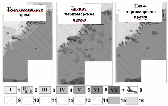 Отмеченные незначительные следы, либо полное отсутствие сапропелевых отложений на шельфе указывает на обстановки донной эрозии и равновесия. Максимальные мощности наблюдаются на всем склоне и геоморфологически приурочены к зонам каньонов, также к конусам выноса каньонов у подножия склона. Минимальные мощности приурочены к подводным холмам и возвышенностям. В глубоководной части также отмечается увеличение мощностей, что объясняется с деятельностью турбидитных потоков и нефелоседиментацией. Новочерноморское время. Вслед за временем образования сапропелевых осадков наступает период прогрессирующей ингрессии вод и иммиграции фауны из Средиземноморского бассейна от 3 тыс. лет назад до современных условий. В это время происходит понижение границы раздела Н2 S/O2 . на шельфе и склоне формируются осадки с эвригалинным фаунистическим комплексом – мидиевые и фазеолиновые отложения. Последние отлагались в морском бассейне, солоноватоводная фауна в них не встречена. Предполагается, что 2,5 тыс. лет назад была фанагорийская регрессия, после которой началась заключительная стадия черноморской трансгрессии. Создались условия для развития устойчивых планктонных сообществ – кокколитофорид. В это время роль хемосинтеза в продуцировании органического вещества резко снизилась и имела существенное значение лишь в зоне континентального склона. В этот период произошло образование маркирующего слоя кокколитов. В целом этот слой на склоне и глубоководной части однороден и сложен целиком кокколитовыми илами и алевритовыми кокколитовыми илами. Наибольшие мощности наблюдаются на склоне в районах каньонов, что связано с гравитационным перемещением и деятельностью турбидитных потоков. Комплекс диатомовых водорослей в кокколитовых илах сравнительно обилен в видовом и беден в количественном отношении, правда, в последнем плане бывают отклонения. В целом доминируют морские формы – планктонные, заметны бентосные. В то же время следует отметить присутствие солоноватоводных видов диатомовых водорослей Stephanodiscus, которые встречаются как одиночные особи. В бассейне, за счет большого притока речных вод встречаются участки опресненных акваторий, равно как сегодняшний северо-западный шельф. В глубоководной части идет накопление пелитовых илов под действием нефелоседиментационных процессов. Можно сделать предположение, что эти илы являются продуктом последней фазы продолжающейся черноморской трансгрессии. ВЫВОДЫ Анализ литологических, минералогических, геохимических характеристик донных отложений новоэвксинского и голоценового возраста, которые формировались в различных условиях, позволил сделать следующие выводы, которые и являются основными защищаемыми положениями работы: 1. Литофации верхнеплейстоцен-голоценовых отложений характеризуются следующими видами пространственно-временных соотношений: На шельфе – новоэвксинские пески и ракушечники перекрываются новочерноморскими мидиевыми илами и алеврито-пелитовыми фазеолиновыми илами. В верхней части склона – новоэвксинские алевритовые глины и алеврито-пелитовые илы перекрываются новочерноморскими алеврито-пелитовыми фазеолиновыми илами и кокколитовыми илами. В нижней части и подножии склона – новоэвксинские глины и алевритовые глины перекрываются древнечер