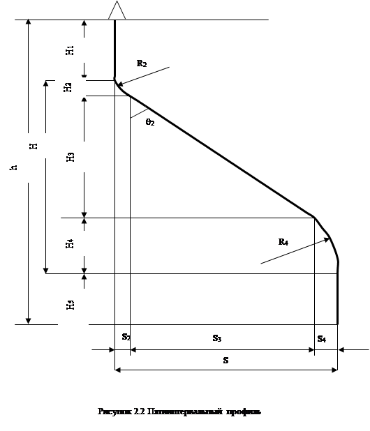 2.2.2 Обоснование и расчёт профиля проектной скважиныПроектирование профилей наклонно направленных скважин заключается, во-первых, в выборе типа профиля, во-вторых, в определении интенсивности искривления на отдельных участках ствола, и, в-третьих, в расчете профиля, включающем расчет длин, глубин по вертикали и отходов по горизонтали для каждого интервала ствола и скважины в целом [5]. Профиль наклонно направленной скважины выбирается так, чтобы при минимальных затратах средств и времени на ее проходку было обеспечено попадание скважины в заданную точку продуктивного пласта при допустимом отклонении. Профили скважины классифицируют по количеству интервалов ствола. За интервал принимается участок скважины с неизменной интенсивностью искривления. По указанному признаку профили наклонно направленных скважин подразделяются на двух, трех, четырех, пяти и более интервальные. Кроме того, профили подразделяются на плоские - расположенные в одной вертикальной плоскости, и пространственные, представляющие собой пространственную кривую линию. В данном разделе рассматриваются только плоские профили [5]. Исходя из условий, представленных в специальной части дипломного проекта, для реализации поставленных задач применим пятиинтервальный профиль скважины (рис.2.2). Данный тип профиля скважины включает вертикальный участок, участок набора зенитного угла, участок стабилизации зенитного угла, участок падения зенитного угла до 00 или близких к нему значений и второй вертикальный участок. При проведении расчетов пользуемся следующими условными обозначениями: h- глубина скважины по вертикали, м; S- общий отход скважины (смещение), м; n- вертикальная проекция n-го интервала, м; Sn- горизонтальная проекция n-го интервала, м; ln- длина n-го интервала, м; Rn- радиус кривизны n-го интервала, м; L- глубина скважины по стволу, м; qn- зенитный угол скважины в конце n-го интервала, град.