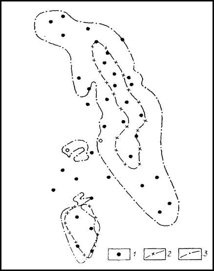 Рисунок 2.5. Совмещение контуров нефтеносности пластов БС11-1 и С11-2: 1 – скважины разведочные; 2, 3 – внешние контуры нефтеносности пластов БС11-1 и БС11-2 соответственно Основной из них пласт БС11-2 вскрыт на глубине 2416-2507м. Залежи пласта БС11-2 пластово-сводовые с элементами литологического экранирования. В ходе эксплуатационного разбуривания выявлено несколько зон отсутствия коллекторов. Выделяемые пласты БС11-1 и БС11-2, сложены песчаниками средне- и мелкозернистыми и алевролитами крупно-зернистыми. На глубине 2390-2422 м. вскрыт пласт БС11-1, к которому приурочены две пластово-сводовые литологически экранированные залежи Северная и Южная, между которыми находится обширная водонасыщенная зона. Пласт БС11-2 имеет среднюю пористость 21 %, проницаемость 0,123 мкм. кв. Диапазон изменения нефтенасыщенных толщин от 11,2 до 17,2 м. Наибольшие толщины вскрыты в центральной и северной частях основной залежи. Средняя нефтенасыщенная толщина 5,6 м. Коллекторские свойства пласта БС11-1 довольно высокие, пористость изменяется от 19 до 23%. Проницаемость в среднем равна 0,069 мкм.кв. Нефтенасыщенные толщины изменяются в пределах от 0,6 до 7,2 м. (средняя 2,9 м.) В продуктивном горизонте БС10 выделяются два пласта. Отложения пласта БС10-2 вскрыты на глубине 2360-2455 м. Залежь пласта - сводовая литологи-чески экранированная. Пласты БС10-1 и БС10-2 сложены песчаниками и алев-ролитами. Песчаники серые, преимущественно мелкозернистые, алевритистые до алевритовых, переходящие в алевролит, глинистые, по составу аркозовые, цемент порово-пленочный, гидрослюдисто-хлоритовый и хлоритовый. Залежь пласта БС10-1 относится к пластово-сводовому типу. Отложения пласта вскрыты на глубине 2350-2395 м. Между собой пласты БС10-1 и БС10-2 разделены преимущественно глинистым прослоем, толщина которого изменяется от 1 до 10 м. Контуры нефтеносности основной залежи пластов совпадают (рисунком 2.6).