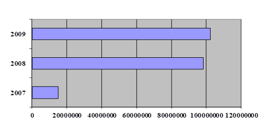 Рисунок 3 – График динамики валюты баланса «ОАО АК Барс» банкаОбщая сумма собственных средств банка за 1999-2006 гг. увеличилась на 698 358 тысяч рублей, к 2009 году – увеличилась по сравнению с 2006 годом на 86 985 677 тыс. рублей. Для анализируемого банка характерно, что в течении данных лет доля уставного фонда уменьшилась с 83% от общего объема собственных средств до 64,5%, но абсолютная сумма фонда изменилась всего на 15396 тысяч рублей. За 2007-2008 гг. доля прибыли в структуре собственных средств возросла более в 2 раза (с 8,54% до 17%), в абсолютной сумме на 300 000 тыс. рублей. За рассматриваемый период доля прибыли в структуре собственных средств возросла на 15% и в абсолютной сумме на 490 000 тысяч рублей. Таким образом, анализ структуры собственных средств банка показывает, что в связи со сложившейся благоприятной ситуацией для банка, произошло увеличение объема собственных средств, доминирующую часть собственных средств составляют различные фонды [9]. 2.2 Пути улучшения деятельности ОАО « АК БАРС» Банк За анализируемый период, с 2007 по 2009 года, заметно улучшилось отношение населения к деятельности банка, возросло доверие населения. Рисунок 4 показывает динамику вкладов за 2007 – 2009 года. Кредитная политика Акционерного коммерческого банка «Ак Барс» направлена на повышение рентабельности кредитных вложений, снижение степени риска и сохранение ликвидности. В соответствии со стратегией банка предпочтение при кредитовании отдается перспективным предприятиям ведущих отраслей экономики Татарстана. Рассмотрим данную тенденцию в структуре кредитных операций на примере таблицы 1.
