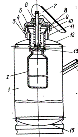 Рис. 1. Огнетушитель ОХП-10: 1 — корпус огнетушителя; 2 — кислотный стакан; 3 — предохранительная мембрана; 4 — спрыск; 5 — крышка огнетушителя; 6 — шток; 7 — рукоятка; 8 и 9 — резиновые прокладки; 10 — пружина; 11 — горловина; 12 — верх огнетушителя; 13 — резиновый клапан; 14 — боковая ручка; 15 — днище 2. Заряд химических пенных огнетушителей ОХП-10 состоит из водного раствора щелочи (бикарбонат натрия) и кислоты (серная кислота). Заряд химических воздушно-пенных огнетушителей ОХВП-10 состоит из аналогичных веществ, но в щелочную часть ОХВП-10 добавляется 500 см3 пенообразователя (ПО-1, ПО-6к, ПО-ЗАИ и т.п.) для увеличения выхода пены и повышения ее эффективности при тушении. 3. Конструктивно ОХП-10 (рис.1) и ОХВП-10 одинаковы, но их внешнее различие состоит в том, что на ОХВП-10 устанавливается пенный насадок (малогабаритный пеногенератор — рис.2 для увеличения кратности выходящей пены.