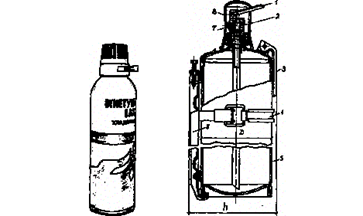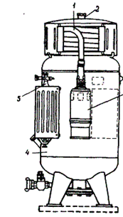 Рис. 5. Стационарный воздушно-пенный огнетушитель ОВПУ-250 (УВП-250):1 — резиновый шланг с вращающейся катушкой; 2 — предохранительный клапан;3 — пеногенератор; 4 — корпус; 5 — пусковой баллон Ранее выпускались огнетушители ОВП-5 (на 5 л) и ОВПУ-250, аналогичный УВП-250. 3. В качестве огнетушащего вещества в огнетушителях используется водный раствор специального пенообразователя (ПО-1; ПО-6к; ПО-ЗАИ и др.), который составляет 4-6% объема заряда. Для подачи пены в огнетушителях устанавливаются пусковые газовые баллоны (углекислота, воздух, азот и др.) вместимостью, соответствующей его заряду. 4. Для приведения в действие ручного огнетушителя ОВП-10 (см. рис.3) необходимо:снять с помощью транспортной рукоятки 6 огнетушитель и поднести его к месту горения;сорвать пломбу и нажать на рычаг запорно-пускового устройства 8, при этом игла вскрывает баллончик с рабочим газом, под действием которого повышается давление в корпусе и раствор пенообразователя подается через сифонную трубку и шланг к стволу-распылителю 5, где, смешиваясь с подсасываемым воздухом, образуется воздушно-механическая пена средней кратности;направить пену на очаг горения. При работе огнетушитель необходимо держать в вертикальном положении. 5. Для приведения в действие передвижного огнетушителя ОВП-100 (см. рис.4) необходимо: установить тележку в вертикальном положении в 5-6 м от очага горения и размотать шланг, не допуская перегибов и скручиваний; сорвать пломбу и открыть до отказа запорное устройство (вентиль или рычаг) пускового баллона; направить струю пены на очаг горения. 6. Для приведения в действие огнетушителя ОВПУ-250 (УВП-250) (см. рис.5) необходимо: размотать шланг 1 с пеногенератором 3 и направить на очаг пожара; сорвать пломбу и до отказа открыть запорное устройство (вентиль или рычаг) пускового баллона 5. 7. Тактико-технические характеристики воздушно-пенных огнетушителей приведены в приложении 2. 8. Перезарядка огнетушителей производится ежегодно, заменяется водный раствор пенообразователя, проверяется вместимость пускового баллона путем его взвешивания (ОВП-100 и УВП-250). Баллоны с рычажным запорным устройством проверяются один раз в год, а с вентильным запором — один раз в квартал путем взвешивания. Если утечка газа из пускового баллона составляет более 5% массы заряда, то баллон должен быть заменен или отправлен на перезарядку. Масса газа заряженного пускового баллона определяется как разность масс пустого и заряженного баллона (значения массы оттиснены на горловине баллона). 9. При периодических осмотрах следует обращать внимание на целость шлангов, чистоту пеногенераторов, состояние пусковых баллонов (ОВП-100 и УВП-250), а также транспортных колес (ОВП-100). 10. Не рекомендуется устанавливать воздушно-пенные огнетушители вблизи источников с высокой температурой, так как для водного раствора пенообразователя оптимальной температурой является 20°С, при которой он дольше сохраняет свои огнетушащие свойства. 4. Газовые огнетушители 1. В газовых огнетушителях в качестве огнетушащего средства применяются негорючие газы (двуокись углерода) или галоидуглеводородные соединения (бромэтил, хладон). В зависимости от применяемого огнетушащего средства огнетушители называются углекислотными, хладоновыми, бромхладоновыми и т.п. 2. Углекислотные огнетушители (ОУ) получили наибольшее распр