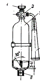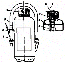 Рис.7. Ручной углекислотный огнетушитель ОУ-5 (ОУ-8): 1 — баллон; 2 — поворотный раструб; 3 — запорная головка; 4 — сифонная трубка;5 — хомут; 6 — крюк; 7 — упор; 8 — ручка; 9 — чека
