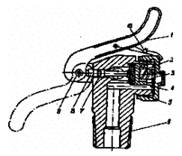 Рис. 10. Запорно-пусковое устройство рычажного типа УН-52: 1 — рычаг; 2 — пружина; 3 — прокладка; 4 — седло клапана; 5 — гайка;6 — хвостовик; 7 — манжета; 8 — шток клапана; 9 — ось рычага; 10 — пломба Запрещается применять эти огнетушители для тушения щелочных металлов. 15. Хладоновые огнетушители по эффективности тушения превосходят углекислотные огнетушители, т.е. для тушения требуется меньше огнетушащего состава огнетушителя по массе и объему. Заряд этих огнетушителей токсичен, поэтому тушить загорание в закрытых помещениях объемом менее 50 м3 следует через дверные проемы или вентиляционные отверстия. После тушения загорания помещение следует тщательно проветрить. Из-за небольших габаритных размеров эти огнетушители используются для тушения загораний автотранспорта, судов и других транспортных механизмов. 16. Для приведения в действие хладоновых огнетушителей или их разновидностей следует поднести их за ручку к очагу пожара и, нажимая на кнопку или рычаг запорно-пускового устройства, вскрыть предохранительную мембрану и направить струю на пламя.