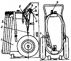 Рис. 4. Передвижной воздушно-пенный огнетушитель ОВП-100: 1 — корпус огнетушителя; 2 — тележка; 3 — крышка; 4 — пеногенератор;5 — предохранительный клапан; 6 — запорное устройство; 7 — баллон высокого давления;8 — резиновый шланг