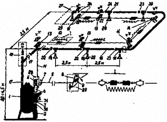 Рис. 14. Схема устройства стационарного автоматического огнетушителя ОПА:1 — корпус огнетушителя; 2 — баллон для сжатого газа; 3 — направляющая труба для груза; 4 — пусковой груз; 5 — пусковой многозвенник; 6 — тросовая система ручного пуска;7, 13 и 14 — направляющие ролики; 8 — рукоятка ручного пуска; 9 — предохранительная чека; 10 — пороговый клапан; 11 — тросовая система автоматического пуска;12 —легкоплавкий и легковыжигаемый замки; 15 — кронштейн; 16 — распределительная сеть; 17 — соединительная муфта; 18-21 — тройники; 22-24 — контргайки; 25 — угольник;26 — распылитель; 27 — диктующий участок трубопровода; 28 — узел автоматического пуска; 29 — узел ручного пуска; 30 — запорно-пусковое устройство; 31 — чека блокировки пускового груза 5. Автоматические порошковые огнетушители ОПА-50 и ОПА-100 (см. рис. 14) используются для защиты технологических установок или небольших помещений. Конструкция огнетушителей позволяет использовать их в качестве автоматических установок пожаротушения модульного типа (рис. 15). Номинальная длина распределительной сети составляет 24 м, а число распылителей не более шести.
