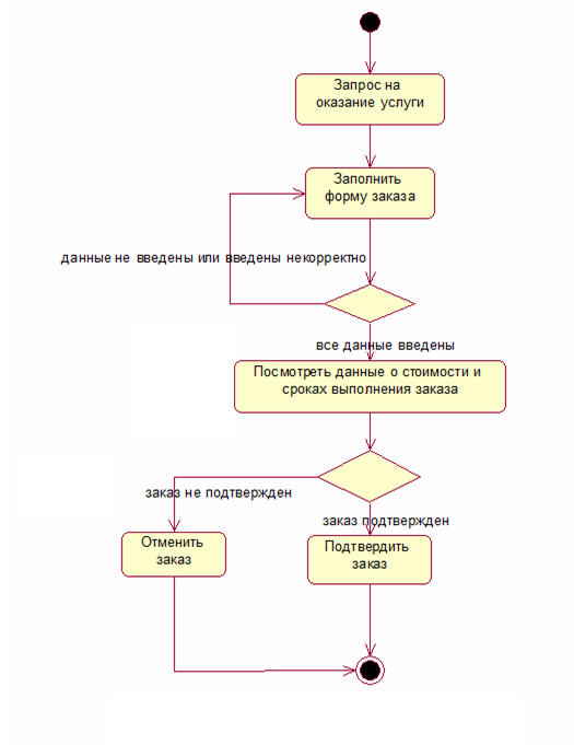 Рисунок 10 – Диаграмма деятельности системы для варианта использования «Оформление заказа» Данная диаграмма описывает поток событий, происходящий в системе при выполнении клиентом запроса на оформление заказа. 4.3 Диаграмма последовательности системы Рисунок 11 – Диаграмма последовательности системы для варианта использования «Оформление заказа» Данная диаграмма описывает последовательность во времени событий, происходящих в системе при выполнении клиентом запроса на оформление заказа. 5 СПЕЦИФИКАЦИЯ СОСТОЯНИЯ ПРОЕКТИРУЕМОГО ПО Для спецификации состояния системы построим диаграмму классов для данной системы. Внимательно изучив описание предметной области требований системы, мы можем заметить, что отдельные именные группы встречаются чаще обычного: запчасти, услуги, заказ, клиент, счет, машина, персонал автосервиса, автосервис и т.п. Отсеяв неподходящие и сомнительные для создания отдельных классов именные группы, мы можем выделить несколько существительных подходящих для создания классов. Из них мы выбираем те, для которых предельно ясно назначение в системе, которые подходят для описания множества объектов, и имеют характерные наборы атрибутов. В итоге классами в нашей системе станут услуга и заказ.