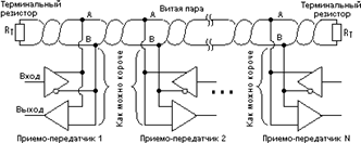 На рисунке изображена локальная сеть на основе интерфейса RS-485, объединяющая несколько приёмо – передатчиков. Общие рекомендации Лучшей средой передачи сигнала является кабель на основе витой пары. Концы кабеля должны быть заглушены терминальными резисторами (обычно 120 Ом). Сеть должна быть проложена по топологии шины, без ответвлений. Устройства следует подключать к кабелю проводами минимальной длины. Витая пара является оптимальным решением для прокладки сети, поскольку обладает наименьшим паразитным излучением сигнала и хорошо защищена от наводок. В условиях повышенных внешних помех применяют кабели с экранированной витой парой, при этом экран кабеля соединяют с защитой «землёй» устройства. Согласование Терминальные резисторы обеспечивают согласование «открытого» конца кабеля с остальной линией, устраняя отражение сигнала. Номинальное сопротивление резисторов соответствует волновому сопротивлению кабеля, и для кабелей на основе витой пары обычно составляет 100 – 120 Ом. Например, широко распространённый кабель UTP-5, используемый для прокладки Ethernet, имеет импеданс 100 Ом. Специальные кабели для RS-485 марки Belden 9841 … 9844 – 120 Ом. Для другого типа кабеля может потребоваться другой номинал. Резисторы могут быть запаяны на контакты кабельных разъёмов у конечных устройств. Иногда резисторы бывают смонтированы в самом устройстве и для подключения резистора нужно установить перемычку. В этом случае при отсоединении устройства линия рассогласовывается, и для нормальной работы остальной системы требует подключение согласующей заглушки. Уровни сигналов Интерфейс RS-485 использует балансную (дифференциальную) схему передачи сигнала. Это означает, что уровни напряжений на сигнальных цепях А и В меняются в противофазе, как показано на приведённом ниже рисунке: