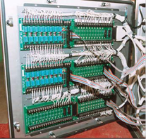 Для регулирования температуры используются регуляторы РТ-ДО 50. при открытом клапане КП1 в работе находится регулятор 1 (Рег.1), выполняющий поддержание температуры около уставки 95±5˚С. При открытии клапана КП2 (одновременное открытие обоих клапанов при выполнении режима невозможно) в работу вступает регулятор 2 (Рег. 2) для поддержания температуры 80±5˚С. Аппаратная логика системы делает невозможным осуществление технологического процесса при отключённых компьютерах. В этом случае автоматически закрываются клапаны и останавливаются вентиляторы, что соответственно приводит к исключению неконтролируемого роста температуры и повышения концентрации растворителей. Сигнализаторы довзрывоопасной концентрации обеспечивают гаранторованное оповещение персонала о превышении допустимой концентрации паров растворителей (формируются сигналы, идущие на компьютер и чирену, компьютер вырабатывает и направляет сигналы на звуковые колонки, расположенные внутри пультов, и на мнемосхемсы технологического участка). При возникновении опасных технологических ситуаций (перегрев, останов вентиляторов, высокая концентрация паров растворителей и др.) компьютер формирует команды автоматического управления (блокировки), направленные на стабилизацию или останов технологического процесса. Структура и аппаратные средства системы При выборе аппаратных средств системы предпочтение отдавалось изделиям фирмы Advantech. На предприятии имеется положительный опыт долговременного использования оборудования данного производителя, которое зарекомендовало себя надёжным в работе и простым в эксплуатации. Большим плюсом при подборе оборудования явилась широкая номенклатура компонентов автоматизации Advantech, позволившая выбрать именно то, что необходимо. В частности, для сбора данных и формирования команд управления применены: ● для аналогового ввода - универсальные платы PCL_812PG; ● для дискретного ввода - PCL730 и PCL_733; ● для дискретного вывода - PCL_730 в комплекте с платами релейной коммутации PCLD_885. Подключение всех входных сигналов произведено через клеммные платы PCLD_880, выходных — через PCLD_885, смонтированные на задней двери пульта управления PurgeWorkstation (рис. 2).