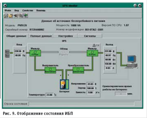 Затрагивая тему информационной безопасности, можно отметить, что для разграничения прав доступа в системе реализована идентификация пользователей по паролю. Имеется четыре категории пользователей: обслуживающий персонал, операторы, технологи и администратор системы. Обслуживающий персонал обладает правами на просмотр состояния технологического оборудования и технологических параметров, операторы могут выполнять контроль и управление. Технологи имеют права, аналогичные тем, которыми обладают операторы, дополнительно они могут изменять параметры технологического процесса. Администратор имеет право создавать, удалять, изменять учетные записи пользователей, а также обладает всеми возможностями других категорий пользователей. По завершении работы с системой для предотвращения несанкционированного управления эксплуатирующий персонал завершает свой сеанс управления, оставляя систему в защищённом режиме (возможен только просмотр). Для входа в сеанс управления пользователь должен подтвердить свои права вводом пароля. Также одной из полезных функций ПО системы является динамическое подключение сигналов к платам ввода-вывода, когда без корректировки ПО технолог может указать, к какому выводу платы подключён тот или иной сигнал. Данная функция обеспечивает гибкость системы при монтаже и наладке аппаратной части АСУ ТП. На компьютерах АСУ ТП «Пульс» выполняется одинаковое ПО, одной из функций которого является синхронизация текущих и накопленных данных. Разработка системы также потребовала написания: ● драйверов для плат ввода-вывода PCL_730 и PCL_733; ● программы контроля состояния источника бесперебойного питания Power Ware 9120 (рис. 9); ● программы копирования архивов с компьютеров АСУ ТП, работающих под управлением ОС QNX, на цеховой сервер, работающий под управлением ОС Windows 2000.