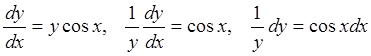 G (y) =F (x) +C . Рассмотрим практический пример: Найти общее решение уравнения y' = y cos x. Решение . Правая часть уравнения представляет собой произведение двух функций, одна из которых зависит от х , а другая от у . Следовательно - это уравнение с разделяющимися переменными. Выразим производную через дифференциалы и разделим переменные: