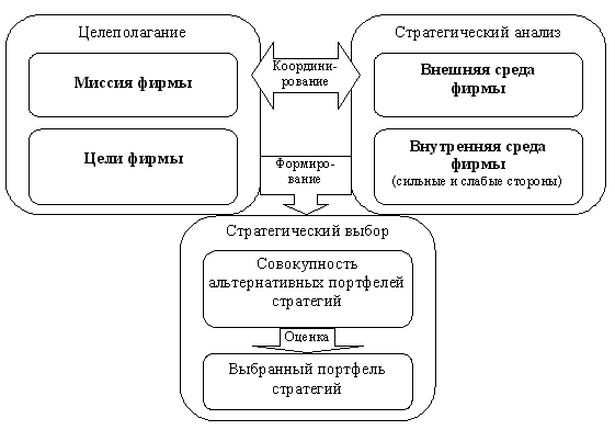 Рис. 1. Этапы формирования стратегии фирмы и их взаимосвязи Все формируемые стратегии малого предприятия по сути своей могут быть только адаптивными. Это обусловлено тем, что вследствие малых объемов хозяйственной деятельности и ее результатов эти предприятия не могут влиять на сегменты рынка, в которых работают, а вынуждены приспосабливаться (адаптироваться) к тем условиям, которые сложились на рынке. При этом неизбежна высокая степень периодичности пересмотра и корректировки портфеля стратегий таких предприятий. Частота изменения стратегий зависит от темпов изменения внешней среды (роста сегмента рынка, изменения структуры спроса и т.д.), производственных технологий, условий конкуренции. Поскольку малые предприятия удовлетворяют локальные потребности, им приходится иметь дело с большим числом видов продукции (работ, услуг), постоянно следить за изменением потребностей своих клиентов, уметь быстро переориентироваться на удовлетворение других потребностей. Вместе с тем им необходимо применять простые, но эффективные методы стратегического анализа и обоснования стратегического выбора, использовать главным образом качественные или простые количественные показатели, бальные экспертные оценки и т.п. При формировании миссии конкретного предприятия должны быть определены: удовлетворяемые им потребности; обслуживаемые потребители; реализуемые технологии; территориальные границы их деятельности. Исходя из миссии, устанавливается система целей предприятия, определяющая: весь процесс планирования, организации, мотивации, контроля; способы повышения эффективности организации; основания для принятия любого делового решения. Главными критериями при этом являются: необходимая конкретность целей, их гибкость и наличие пространства для их корректировки в связи с непредвиденными изменениями, измеряемость и совместимость целей. Цели каждого следующего уровня не должны входить в противоречие с целями предыдущего уровня, а цели одного уровня не должны противоречить друг другу. В общем случае анализ среды малого предприятия – это процесс определения критически важных элементов внешней и внутренней среды, которые могут оказать влияние на способность фирмы к достижению поставленных целей. Более конкретно: необходим анализ «рабочей» и «общей» среды. Рабочая – это среда непосредственных контактов фирмы с теми участниками рынка, которые оказывают на нее прямое воздействие (поставщики всех видов ресурсов, потребители продукции фирмы, конкуренты, посредники, контактные аудитории). Общая среда состоит из элементов, которые не связаны с фирмой напрямую, но оказывают влияние на атмосферу бизнеса. На начальном этапе фирма должна определить пределы анализа среды, обусловленные: а) числом и характером критических точек или наиболее значимых элементов среды; б) временными рамками ее деятельности; в) спецификой каждого элемента среды. Критические точки зависят от размеров малого предприятия, характера его деятельности, выбранных целей и т.д. Размер предприятия серьезно влияет на определение значимых факторов внешней среды. Малые предприятия не имеют достаточных средств для регулярного отслеживания изменений общей среды. К тому же анализ внешней среды у них обычно ограничен небольшими временными рамками, в которых можн