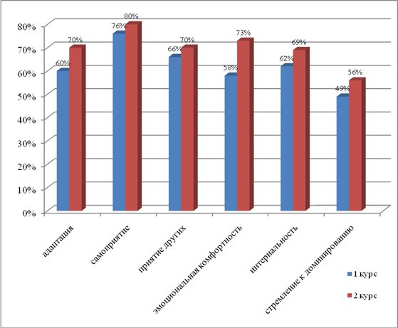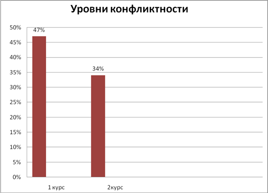 Анализ полученных нами данных по проведенной методике (методика диагностики социально-психологической адаптации К. Роджерса и Р. Даймонда)показывает что в процессе адаптации на 2 курсе намного выше показателей адаптации на 1 курсе. Особо ярких конфликтных ситуаций не наблюдается ни на одном из курсов. Показатели по приятию других людей высокие, это говорит о низком уровне конфликтности в группах. Эмоциональная комфортность у студентов так же высокая, что показывает о качественном процессе адаптации в вузе. Стремление к доминированию на обоих курсах по результатам проведенной методике не высокие. В общем можно сказать что все показатели входят в норму, и какие – либо отклонения отсутствуют.2.2 Тест «Оценка уровня конфликтности личности» Этот тест выявляет уровень развития конфликтности личности, Уровни развития конфликтности