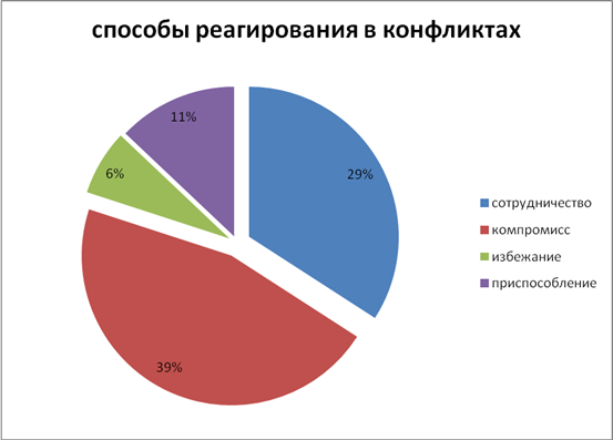 Выводы Студенческий период является сенситивным периодом для развития основных социогенных потенций человека (Б.Г. Ананьев). Исключительное значение для выявления причин, приводящих к снижению социально-психологической адаптации, имеет изучение личностных особенностей студентов и специфики организационной культуры вуза и учебного процесса. Их объективизация приобретает особую актуальность, так как грамотная диагностика, коррекция и профилактика развития социально-психологической дезадаптации может помочь в становлении личности специалиста, сохранив студента как здоровую личность и эффективного профессионала. Оценка динамики и состояния социально-психологической адаптации студента имеет большое значение для анализа процесса профессионального становления личности, для планирования его профессиональной карьеры. Исследование социально-психологической адаптации способствует более углубленному пониманию возрастной динамики и уточнению критериев,свидетельствующих о наступлении возрастных и профессиональных кризисов. По проведенными нами методиками можно сделать вывод, что процесс адаптации 1-го и 2-го курсов «ПиП» проходит довольно успешно, это доказывает и тот факт, что оценка эмоциональной комфортности оказалась довольно высокой у студентов обоих курсов. Из анализа средне групповых значений успеваемости по предметам можно сделать вывод о том, что успеваемость приблизительно одинакова по разным предметам (и общеобразовательным, и специальным) для каждой группы, и т.о. наиболее вероятно, что оценки отражают не уровень адаптированности, а какие-то неучтенные в данном исследовании факторы. Это может быть фактор сложности предмета, фактор требований преподавателя, стереотип в отношении оценивания успеваемости в данном вузе или эмоциональное состояние студентов. Таким образом, результаты исследования подтверждают выдвинутую гипотезу о том, что адаптация к вузу - это сложный и многофакторный процесс. Уровень конфликтности в процессе адаптации выше, чем в уже сложившемся коллективе. Показатели по третьей методике: тест «оценка способов реагирования в конфликте» показал что основая масса студентов в конфликтной ситуации склонны идти на компромисс, а так же на сотрудничество. ЗАКЛЮЧЕНИЕ Конфликты возникают в результате столкновения противоречивых тенденций в деятельности отдельных людей, групп, социальных структур и появляются в форме конфронтации идей, борьбы за извлечение различных выгод, монопольное господство в определенных сферах деятельности. Процесс адаптации это тоже своего рода деятельность людей, отдельных личностей, приспособление индивидов к новым условиям социальной среды, формирование адекватной системы отношений с социальными объектами, интеграция личности в социальные группы, деятельность по освоению относительно стабильных социальных условий, принятие различных норм и ценностей новой социальной среды, сложившихся в ней форм социального взаимодействия. Несмотря на то, что взаимоотношения с другими людьми должны способствовать мир и гармония, конфликты неизбежны. Каждый здравомыслящий человек должен обладать умением эффективно улаживать споры и разногласия, чтобы ткань общественной жизни не рвалась с каждым конфликтом, а, наоборот, крепла вследствие роста умения находи