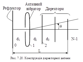 Розрахунки показують, що ДС у площинах Е та Н майже однакові, внаслідок чого КСД системи збільшується до 5...7. Оскільки екран ненастроєний, розширюється робочий діапазон частот. Тому така система широко використовується як первинний опромінювач дзеркальних антен. Особливості конструкції та спрямованих властивостей директорних антен З метою звуження ДС та підвищення КСД використовують директорну антену або антену типу “хвильовий канал” (в іноземній літературі – антена Яги або Уда-Яги). Така антена є лінійною дискретною системою, що складається із однаково орієнтованих та розміщених в одній площині одного активного вібратора, рефлектора та декількох директорів (рис. 7.20). Центри вібраторів приєднуються до металевої або діелектричної стріли. Постановка більш одного рефлектора неефективна, оскільки поле за рефлектором слабке. Рефлектор розміщують на відстані (0,15...0,25)λ від активного вібратора. Кількість директорів, зазвичай, не перевищує 10...12. Відстань між ними (0,1...0,35)λ. Активний вібратор виготовляють на 3...5% коротшим напівхвильового; директори укорочені на 5...15%, а рефлектор на 2...5% довший напівхвильового. Директори збуджуються хвилею, що розповсюджується впродовж осі, утворюючи своєрідний “хвильовий канал”. Відповідно до цього директорна антена подібна антені біжучої хвилі.