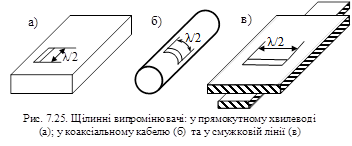 При цьому діапазонні властивості антени зберігаються практично незмінними, а максимум випромінювання у площині Н виявляється орієнтованим вздовж бісектриси кута γ в сторону точок живлення. ДС у площині Е (площина, що проходить через бісектрису кута γ та паралельна осям вібратора) приблизно така ж як і в плоскій антені. ДС у площині Н (площина YOZ) суттєво залежить від кута γ і при правильному його виборі може стати вужчою, ніж у площині Е. ШДС у площині Н залежить також від кута α: чим менший цей кут (чим довша активна частина антени), тим більш гострою буде ДС. Логоперіодичні антени використовуються для КХ та УКХ зв’язку, часто використовують як опромінювач дзеркальної антени. Перевагою логоперіодичних антен над директорними є їх широкодіапазонність. Логоперіодична антена може працювати у дуже широкому діапазоні частот (коефіцієнт перекриття частотного діапазону дорівнює S=10 та більше). Типи щілинних випромінювачів Щілинні випромінювачі являють собою вузькі щілини, що прорізані у стінці хвилеводу, резонатора, коаксіального кабелю та на смужковій лінії (рис. 7.25, а). Ширина щілини становить (0,03…0,05)λ, довжина їх близько півхвилі. Щілини прорізаються так, щоб вони перетиналися лініями