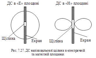 При застосуванні принципу подвійності Пістолькорса до відомої з електродинаміки структури поля елементарного електричного вібратора можна отримати поле від елементарної щілини (ℓщ <<λ). Аналогічно можна знайти поле від напівхвильової щілини, якщо відоме поле від симетричного напівхвильового вібратора. ДС напівхвильової щілини та напівхвильового симетричного вібратора однакові (рис. 7.27).