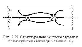 При поперечних щілинах на широкій стінці хвилеводу або повздовжніх щілинах на вузькій стінці відстань між сусідніми щілинами дорівнює λх (рис. 7.28, а). Такі антени називаються прямофазними . Якщо повздовжні щілини розміщені на широкій стінці хвилеводу (рис. 7.28, б), то ця відстань дорівнює λх/2. Додатковий зсув фази на π відбувається через те, що поперечна складова поверхневого струму змінює свій напрямок при переході середньої лінії широкої стінки хвилеводу (рис. 7.29). Антени, у яких сусідні щілини мають додатковий зсув фази на π, називаються зміннофазними . Через синфазність щілин головний максимум ДС резонансних антен перпендикулярний до осі хвилеводу (рис. 7.29). Резонансні антени зазвичай працюють у режимі стоячої хвилі, для забезпечення якого в кінці антени (хвилеводу) розміщують короткозамкнений поршень (рис. 7.30). Відстань між поршнем та останньою щілиною для решіток із повздовжніми щілини має дорівнювати