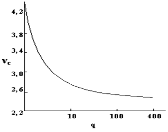 Рисунок 3 – Залежність VC від q (параметра форми профілю показника заломлення) в одномодових волокнах з градієнтним профілем серцевини.З рисунку видно, що VC зростає від ~2,405 для східчастого профілю (q=¥) до 4,381 для трикутного (q=1). Зокрема, для q=2 (тобто параболічного профілю) VC »3,52, що означає - параболічний профіль серцевини в одномодовому волокні дає можливість одержувати одномодовий режим при дуже великих в при певних l. Вище відзначалося, що в одномодових волокнах за умови ізотропності поширюється одна мода. З цієї причини в такому волокні відсутня модова дисперсія. Проте, у процесі поширення оптичних імпульсів їхня тривалість зростає. Причиною цього розширення імпульсів є хроматична дисперсія. Вона викликана залежністю показника заломлення від довжини хвилі світла, що поширюється, Згідно з даними, наведеними у, коефіцієнт заломлення :