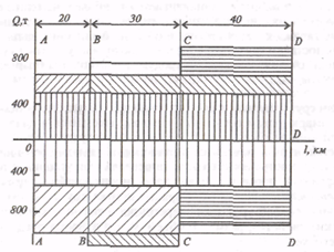 Таблица 1 – Эпюра грузопотока на автомобильном транспорте Эпюра имеет прямое и обратное направление движения грузов. Прямым направлением считается то, по которому следует наибольшее количество грузов. Отношение размера грузопотока в прямом направлении к размеру грузопотока в обратном направлении называется коэффициентом неравномерности грузопотоков по направлениям. Объем грузов, перевозимых в прямом направлении, откладывают вверх от нулевой отметки, а в обратном – вниз от неё. Для условий, приведенных в табл. 1, прямое направление: DA = ВА + СА + DA + СВ + DC =500 +500 + 100 + 400 = 1500 т, обратное: AD = АВ + АС + AD + ВС т BD + CD = 200 + 500 + 100 +200 + 300 =1300 т. Отсюда коэффициент неравномерности грузопотоков: з= Qnp/ Qоб =1500 /1300 =1,15. Построение эпюры начинают с грузопотока, идущего от пункта D, т.е. самого дальнего, к пункту А. При масштабе 1 см = 200 т на графике откладывают от нулевой отметки 2,5 см и проводят линию, параллельную оси абсцисс, до пересечения с ординатой точки А. Полученное пространство между осевой и проведенной линией заштриховывают (различно по участкам). Затем откладывают грузопоток объемом 500 т, следующий из С в А, и проводят линию от ранее отложенной и параллельную ей до пересечения с ординатой точки А. Полученное пространство также заштриховывают. Аналогично откладывают и следующие грузопотоки. Нижняя часть строится таким же способом, как и верхняя. Полученная эпюра (рисунок 1) предоставляет собой графическое изображение грузопотоков на данном участке трассы.