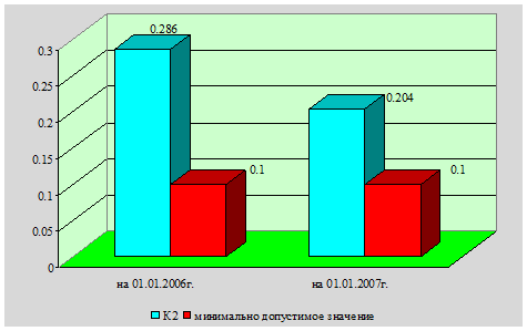 Рисунок 4. Коэффициент обеспеченности собственными оборотными средствами, К2 На 01.01.2006 г.:(1443884 + 1522 - 1265946) / 627793 = 0,286 На 01.01.2007 г.:(1417755 + 2406 - 1233321) / 915181 = 0,204 Коэффициент обеспеченности собственными оборотными средствами на начало и конец отчетного периодов имеет значение выше нормативного, это свидетельствует о том, у УП «Минский хладокомбинат № 1» достаточно собственных оборотных средств для ведения хозяйственной деятельности и обеспечения финансовой устойчивости. Коэффициент обеспеченности финансовых обязательств активами: На 01.01.2006 г.:448333 / 1893739 = 0,237 На 01.01.2007 г.:728341 / 2148502 = 0,339 Значение данного коэффициента выше нормативного, то есть УП «Минский хладокомбинат № 1» способно рассчитаться по своим финансовым обязательствам после реализации активов.
