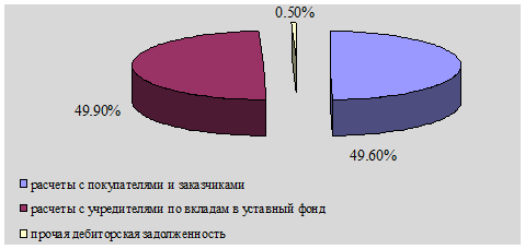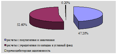 Рисунок 10. Структура кредиторской задолженности УП «Минский хладокомбинат № 1» на 01.01.2007 г. По сравнению с 2005 г. в 2006 г. в структуре кредиторской задолженности УП «Минский хладокомбинат № 1» произошли следующие изменения: - увеличение расчетов с поставщиками и подрядчиками на 254299 тыс. руб. и увеличение их удельного веса в общей сумме кредиторской задолженности на 6,7 %; - увеличение расчетов по оплате труда на 9180 тыс. руб. и снижение их удельного веса в общей сумме кредиторской задолженности на 1,7 %; - снижение расчетов по прочим операциям с персоналом на 35 тыс. руб., их удельный вес в общей сумме кредиторской задолженности остался неизменным (0,1 %); - расчеты по налогам и сборам увеличились на 18223 тыс. руб., а их удельный вес в общей сумме кредиторской задолженности снизился на 4,0 %; - увеличение расчетов по социальному страхованию и обеспечению на 906 тыс. руб. и снижение их удельного веса в общей сумме кредиторской задолженности на 1,0 %. Анализ структуры дебиторской задолженности УП «Минский хладокомбинат № 1» приведен в таблице 9. Таблица 9. Анализ структуры дебиторской задолженности УП «Минский хладокомбинат № 1»