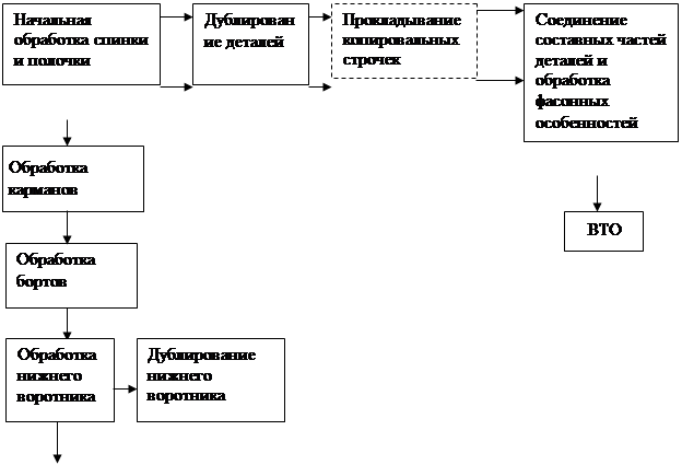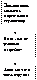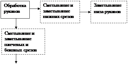 3. Разработка схемы последовательности сборки и обоснование степени готовности изделия к примерке Конструктивное решение модели оказало существенное влияние на технологическую последовательность и эффективность методов обработки и изделия в целом. Схему сборки изделия разработана с учетом фасонных и конструктивных особенностей выбранной модели. Особенностью процесса изготовления изделий по индивидуальным заказам является наличие примерки, что дало возможность обеспечить точную подгонку изделия по фигуре заказчика. Степень готовности изделия к примерке устанавлина в зависимости от вида изделия и услуг. Степень готовности изделия к примерке может быть различной в зависимости от фигуры заказчика, вида изделия, свойств материалов, квалификации закройщика, числа примерок и т.д., но во всех случаях степень готовности должна быть рациональной, а время на повторное выполнение отдельных операций после проведения примерок - минимальным. Кроме того, изделие, подготовленное к примерке, должно дать заказчику полное представление о форме, размерах деталей и отделочных элементов. Вторая примерка рекомендована в том случае, когда изделие сложного фасона из материалов с малоизвестными технологическими свойствами или фигура заказчика имеет резкие отклонения от типовой. Повторную примерку проводят: главным образом для уточнения правильности вметывания рукавов в пройму и для уточнения длины изделия. Схема последовательности сборки и степень готовности изделия к примерке заданного изделия, представлены в виде общей схемы (рис.2).