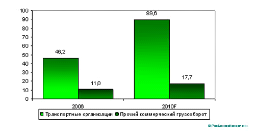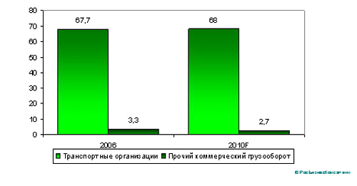 Источник: МЭРТ, Минтранс, РБК. Рисунок 1.2 Коммерческий грузооборот морского транспорта России, 2006-2010 гг, млрд. т-км. Перспективы развития морских перевозок отечественным транспортным флотом общего пользования в значительной степени зависят от успешности реализации Федерального закона, касающегося создания Российского международного реестра судов и увеличения флота под флагом России. При условии строительства и ввода начиная с 2007 г. в состав флота новых судов рост объемов коммерческих перевозок морским транспортом в 2010 г. прогнозируется на уровне 187,5% к 2006 г. В структуре грузооборота водным транспортом свыше 60% приходится на операции в международном сообщении. Удельный вес заграничных перевозок в общем объеме перевозок составляет около 30%. Необходимо отметить, что недостаточное финансирование позволяет содержать на качественном уровне только 25% внутренних водных путей и 32% гидротехнических сооружений в безопасном состоянии. Имеются устойчивые тенденции к снижению гарантированных габаритов судовых ходов на Волго-Балтийском водном пути, на Волге, Оби, Лене и Амуре. Емкость рынка грузоперевозок внутренним водным транспортом в 2006 г. оценивается в 700 млн. долл. Перспективы развития отрасли в значительной степени зависят от состояния водных путей и преодоления тенденции старения судоходных гидротехнических сооружений. Несмотря на устранение "узких мест" на внутренних водных путях, включая проведение экстренных дноуглубительных и выправительных работ, возможности по увеличению пропускной способности транспортной технологической инфраструктуры ограничены. По прогнозу МЭРТ РФ, объем грузовых перевозок и грузооборота внутренним водным транспортом в 2010 г. будет на уровне 2006 г. Внутри сегмента коммерческих перевозок увеличится доля специализированных компаний-перевозчиков.
