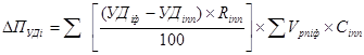 где ∆ Пуд i - влияние структурного фактора на изменение прибыли; Vрп общ.ф - фактический общий объем реализованной продукции; УД iф - удельный вес i - го вида продукции в общем объеме реализации в условно - натуральном выражении или нормо-часах, %; Ппл - сумма прибыли на условную единицу продукции или на один нормо-час. для неоднородной продукции по формуле: