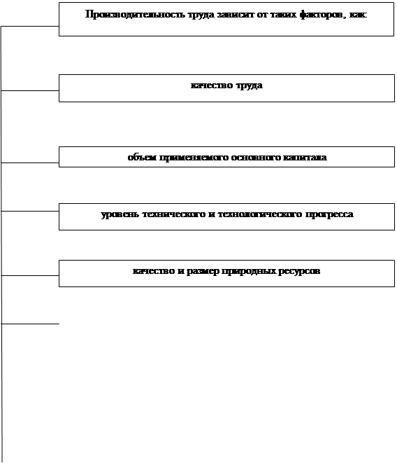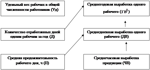 Рисунок 1.2 – Структурно-логическая факторная модель производительности труда Аналогичным образом анализируется изменение среднегодовой выработки рабочего, которая зависит от количества отработанных дней одним рабочим за год, средней продолжительности рабочего дня и среднечасовой выработки: