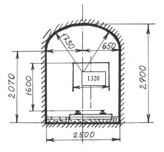 λ = μ/ (1 – μ) = 0,2/(1-0,2) = 0,25 По расчётной оценке запаса прочности Вывод: проектируемая выработка проходится без крепления прямоугольно-сводчатой формой поперечного сечения. 3. Расчёт сечения выработки в свету: Размеры поперечного сечения горизонтальных горных выработок в свету зависят от её назначения и определяются, исходя из габаритов подвижного состава и располагаемого в выработке оборудования, обеспечение пропуска требуемого количества воздуха, зазоров между выступающими частями подвижного состава и крепью, предусмотренные Правилами безопасности, числа прокладываемых в выработке рельсовых путей и способа передвижения людей. В нашем случае мы проектируем горизонтальную выработку с рельсовым видом транспорта, поэтому в соответствии с Правилами безопасности при геологоразведочных работах, минимальная величина прохода 0,7 м, а минимальная величина зазора 0,25 метров. Указанная ширина свободного прохода для людей и зазоров должна быть выдержана по высоте выработки не менее 1,8 м от почвы (тротуара). Проходы для людей на всём протяжении выработок должны устраиваться с одной и той же стороны. Прямоугольно-сводчатые сечения используются при проходке выработок без крепи или с возведением облегчённых конструкций крепи. Высота свода в сечениях от 2 до 6,8 м2