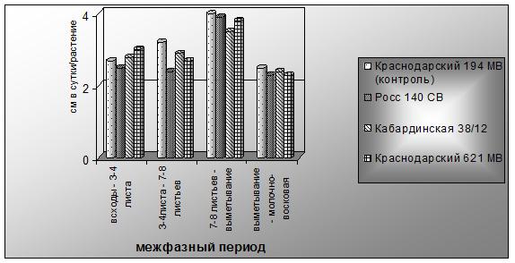 Раннеспелые гибриды уступали по высоте позднеспелым. Оказались самыми низкими Краснодарский 194 МВ (контроль) -69,4 см и Росс 140 СВ – 53,4 см. В фазу выметывания, позднеспелые гибриды значительно превосходили по высоте раннеспелые и самыми высокими были Краснодарский 621 МВ и Кабардинская 38/12 – 245,4 и 240,2 см соответственно. Краснодарский 621 МВ в эту фазу на 35,9 см превышал контрольный гибрид Краснодарский 194 МВ и на 67,1 см Росс 140 СВ. Таким образом, в фазу молочно-восковая спелость высота растений гибрида Краснодарский 621 МВ превышала все изучаемые гибриды на 4,5- – 66,5 см. Нами изучен среднесуточный прирост в высоту растений различных гибридов кукурузы (Рисунок 5).