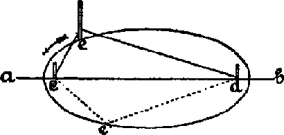 Рис. 3. Проведение параллельных линий Черчение кругов и овалов. В центре будующего круга вбивают кол; на одном конце разметочной нити делаюь петлю, такой величины, чтобы ее можно было совершенно свободно надеть на кол. Отмерив длину радиуса окружности, которую требуется описать, делают на конце вторую петлю, в которую вставляют заостренный кол, которым и обводят окружность, стараясь при этом не наматывать веревку на колья. Овалы легче всего получаются следующим образом. Наметив положение овала определяют линию ав, которая разделяла его пополам по длине, и чертят ее на местности. На этой линии точно отмеряют крайние точки овала, от которых отмеряют равные расстояния до точек c и d, называемых фокусами овала. Чем ближе находятся эти точки к внешней линии овала, тем вытянутее получится сам овал; другими словами сближая и удаляя точки c и d, мы можем получить либо более скругленный, либо более вытянутый овал. В точках c и в вбивают два колышка; третий колышек вбивается в точке e, которая находилась бы приблизительно в самом удаленном пункте линии овала, если бы этот последний разделить пополам по ширине. На эти три кола надевается бичевка, в виде треугольника, которая могла бы свободно вращатся вокруг всех кольев. Вынув колышек e, описывают им в направлении стрелки линию овала, причем бичевка должна всегда быть под натяжением (рис. 4). План сада, соединяющего пейзажность с регулярностью, из книги Batty Langely "New Prinsiples of Gardening or the laying out and planing of parteres" (London, 1728)