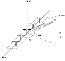 Рис.2 Плоская решетка вибраторных антенн Вибраторные излучатели широко применяются в фазированных антенных решетках в метровом, дециметровом и сантиметровом диапазонах волн. Широкое применение вибраторных ФАР обусловлено рядом их достоинств: относительно малой массой, устойчивостью к атмосферным внешним воздействиям, возможностями складывания и быстрого разворачивания в мобильных радиотехнических системах, получения произвольной поляризации и управления поляризационной характеристикой излученного поля, управления ДН отдельных излучателей, благодаря включению управляемых нагрузок. 1. Анализ технического задания Проектирование антенны в данной работе предполагается осуществить методом неполного математического моделирования. Неполнота метода заключается в приближенном характере применяемых в расчетах формул, в использовании при расчете различных допущений, позволяющих упростить математические выражения, а также в нерассмотрении некоторых факторов, влияющих на режим работы реальной антенны. В целом, использование математических моделей при проектировании реальных антенн существенно сокращает объём экспериментальных исследований, связанных с разработкой излучателей, а в ряде случаев и исключает их. В техническом задании предложено спроектировать линейную ФАР из вибраторных излучателей, настроенную на длину волны Значение мощности в антенне говорит о том, что ее предполагается использовать в режиме передачи, следовательно, следует учесть специфику этого режима как при проектировании фидерного устройства, так и всего устройства в целом. Конструктивно решетка выполняется в виде линейки симметричных вибраторов, ориентированных в пространстве определенным образом. Положение элементов антенны относительно всей решетки зависит от плоскости, в которой должно осуществляться сканирование. По заданию луч должен перемещаться в H-плоскости, соответственно, излучатели должны быть ориентированы таким образом, чтобы ось антенны лежала в H-плоскости каждого из излучателей. С целью обеспечения однонаправленного излучения вибраторы устанавливаются над металлическим экраном. При высотах установки симметричного вибратора над экраном около Примерный вид решетки изображен на рис. 3.