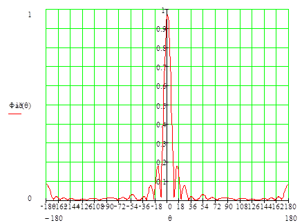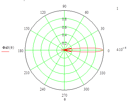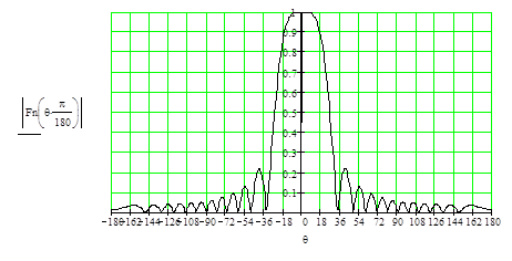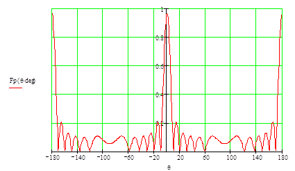 Диаграмма направленности множителя решетки представлена на рис.3, а диаграмма направленности АР представлены рис.4 для случая α =0 и на рис.5 для α =30° в плоскости Е. Для плоскости Н ДН будет иметь вид ДН одиночного излучателя.