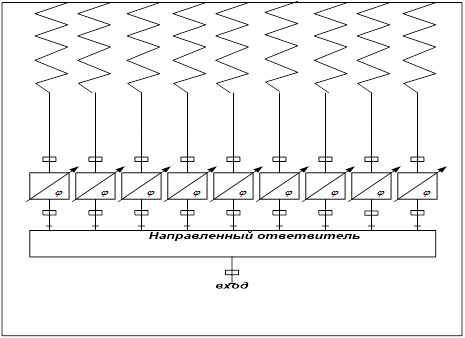 рис.6 Направленный ответвитель распределяет энергию, поступающую от генератора, между излучателями в соответствии с выбранным законом распределения мощности (в нашем случае - "Косинус на пьедестале"), далее энергия поступает на фазовращатели, которые обеспечивают требуемый сдвиг фазы между соседними излучателями, затем, через прямоугольный волновод, энергия поступает непосредственно к элементам решетки спиральным антеннам.