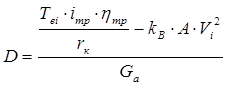 где Vmax – максимальная скорость, м/с (Vmax = 85 км/ч = 23,6 м/с); Ga – вес автомобиля, Н; f – коэффициент сопротивления перекатыванию kB – аэродинамический коэффициент обтекаемости, Н•с2/м4 (kB = 0,6 Н•с2/м4), A - лобовая площадь автомобиля, м2; ηтр - КПД трансмиссии (ηтр = 0,9 [2]).