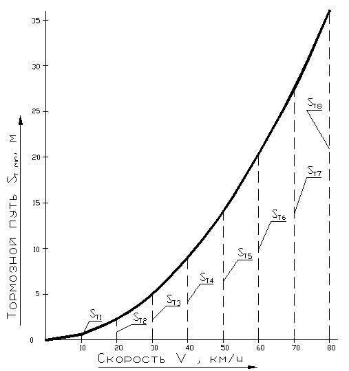 Значения, необходимые для построения графика тормозного пути рассчитываются по формулам 32 - 33. Результаты приведены в таблице 5. Таблица 5 – Данные для построения графика тормозного пути