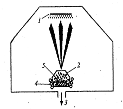 Рис. 1 Схема получения нанопорошков в процессе испарение – конденсация В процессе «испарение - конденсация» жидкие или твердые вещества испаряют при контролируемой температуре в атмосфере инертного газа низкого давления с последующей конденсацией пара в охлаждающей среде или на охлаждающих устройствах (рис. 1). Этот способ позволяет получать частицы размером от двух до нескольких сотен нанометров. Наночастицы с размером менее 20 нм обычно имеют сферическую форму, а у более крупных может появляться огранка. Обычно испаряемое вещество 5 помещают в нагревательную камеру 2 с нагревателем 4 и отверстием (диафрагмой), через которое испарившиеся частицы вещества попадают в вакуумное пространство (с давлением около 0,10–0,01Па), где происходит формирование молекулярного пучка. Частицы, двигаясь практически прямолинейно, конденсируются на охлаждаемой подложке 1.Откачка газа из аппарата осуществляется через клапан 3. Если проводить испарение вещества в режиме, когда нет столкновения между частицами в пространстве диафрагмы, то длина свободного пробега частицы лч >dд (здесь dд - диаметр диафрагмы). Истечение пучка частиц из нагревательной камеры будет эффузионное; интенсивность пучка J, частиц/(см2 ·с), на расстоянии r от источника.