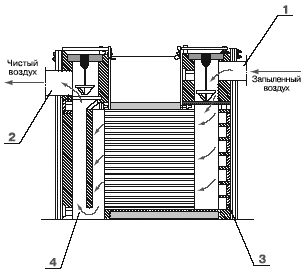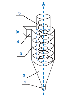 Пылеосадительные камеры (рис. 1 ). Осаждение взвешенных в газовом потоке частиц в пылеосадительных камерах происходит под действием сил тяжести. Простейшими конструкциями аппаратов этого типа являются отстойные газоходы, снабжаемые иногда вертикальными перегородками для лучшего осаждения твердых частиц. Для очистки горячих печных газов широко применяют многополочные пылеосадительные камеры.Пылеосадительная камера состоит: 1 - входной патрубок; 2 - выходной патрубок; 3 - корпус; 4 - бункер взвешенных частиц. Инерционное осаждение основано на стремлении взвешенных частиц сохранять первоначальное направление движения при изменении направления газового потока. Среди инерционных аппаратов наиболее часто применяют жалюзийные пылеуловители с большим числом щелей (жалюзи). Газы обеспыливаются, выходя через щели и меняя при этом направление движения, скорость газа на входе в аппарат составляет 10-15 м/с. Гидравлическое сопротивление аппарата 100 - 400 Па (10 - 40 мм вод. ст.). Частицы пыли с d < 20 мкм в жалюзийных аппаратах не улавливаются. Степень очистки в зависимости от дисперсности частиц составляет 20-70%. Инерционный метод можно применять лишь для грубой очистки газа. Помимо малой эффективности недостаток этого метода - быстрое истирание или забивание щелей. Данные аппараты отличаются простотой изготовления и эксплуатации, их достаточно широко используют в промышленности. Но эффективность улавливания не всегда достаточна. Центробежные методы очистки газов основаны на действии центробежной силы, возникающей при вращении очищаемого газового потока в очистном аппарате или при вращении частей самого аппарата. В качестве центробежных аппаратов пылеочистки применяют циклоны (рис.2) различных типов: батарейные циклоны, вращающиеся пылеуловители (ротоклоны) и др. Циклоны наиболее часто применяют в промышленности для осаждения твердых аэрозолей. Циклоны характеризуются высокой производительностью по газу, простотой устройства, надежностью в работе. Степень очистки от пыли зависит от размеров частиц. Для циклонов высокой производительности, в частности батарейных циклонов (производительностью более 20000 м3 /ч), степень очистки составляет около 90% при диаметре частиц d > 30 мкм. Для частиц с d = 5-30 мкм степень очистки снижается до 80%, а при d == 2-5 мкм она составляет менее 40%.