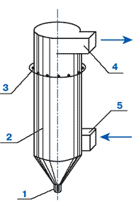 Рис. 2 Рис. 3 На рис. 2 воздух вводится тангенциально во входной патрубок (4) циклона, представляющую собой закручивающий аппарат. Сформировавшийся здесь вращающийся поток опускается по кольцевому пространству, образованному цилиндрической частью циклона (3) и выхлопной трубой (5), в его конусную часть (2), а затем, продолжая вращаться, выходит из циклона через выхлопную трубу. (1) - пылевыпускное устройство.Аэродинамические силы искривляют траекторию частиц. При вращательно-нисходящем движении запыленного потока пылевые частицы достигают внутренней поверхности цилиндра, отделяются от потока. Под влиянием силы тяжести и увлекающего действия потока отделившиеся частицы опускаются и через пылевыпускное отверстие проходят в бункер.Более высокая степень очистки воздуха от пыли по сравнению с сухим циклоном может быть получена в пылеуловителях мокрого типа (рис.3), в которых пыль улавливается в результате контакта частиц со смачивающей жидкостью. Этот контакт может осуществляться на смоченных стенках, обтекаемых воздухом, на каплях или на свободной поверхности воды. На рис. 3 представлен циклон с водяной пленкой . Запыленный воздух подается через воздуховод (5) в нижнюю часть аппарата тангенциально со скоростью 15-21 м/с. Закрученный воздушный поток, двигаясь вверх, встречает пленку воды, стекающую вниз по поверхности цилиндра (2). Очищенный воздух отводится из верхней части аппарата (4) также тангенциально по направлению вращения воздушного потока. В циклоне с водяной пленкой нет выхлопной трубы, свойственной сухим циклонам, что позволяет уменьшить диаметр его цилиндрической части.Внутренняя поверхность циклона непрерывно орошается водой из сопл (3), размещенных по окружности. Пленка воды на внутренней поверхности циклона должна быть сплошной, поэтому сопла установлены так, что струи воды направлены по касательной к поверхности цилиндра по ходу вращения воздушного потока. Пыль, захваченная водяной пленкой, стекает вместе с водой в коническую часть циклона и удаляется через патрубок (1), погруженный в воду отстойника. Отстоявшаяся вода вновь подается в циклон. Скорость воздуха на входе циклона 15-20 м/с. Эффективность циклонов с водяной пленкой составляет для пыли размером частиц до 5 мкм - 88-89%, для пыли с более крупными частицами - 95-100%. Другими типами центробежного пылеуловителя служат ротоклон (рис. 4) и скруббер (рис. 5). Циклонные аппараты наиболее распространены в промышленности, так как у них отсутствуют движущиеся части в аппарате и высокая надежность работы при температуре газов до 5000 С, улавливание пыли в сухом виде, почти постоянное гидравлическое сопротивление аппарата, простота изготовления, высокая степень очистки.