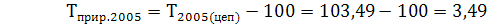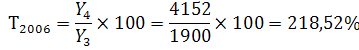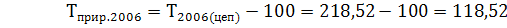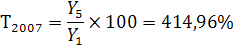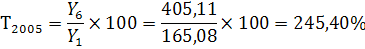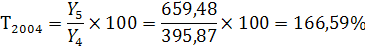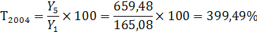 По данным очевидно, что тенденция денежной выручки от реализации подсолнечника в целом положительна по сравнению с базисным 2003 годом, однако этого недостаточно, чтобы выявить динамику изменения выручки, так как для этого необходимо влияние нескольких факторов, которые в расчетах не учитывались. При анализе общественных явлений важную роль играет изучение темпов роста и прироста показателей. 2. Темп роста. Он показывает как быстро или какими темпами изменяется общественное явление, выражается в процентах. Определяется также двумя способами. а) Цепной . Определяется как отношение каждого последующего уровня ряда динамики к предыдущему, умноженному на сто. (Темп прироста обозначим через Т):