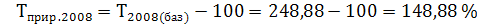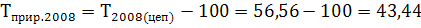 По рассчитанным показателям видно, что по отношению к базисному году, темп роста был относительно положительным и возрастал до 2007 года, однако в 2008 году резко снизился. Динамика не выявлена, определенной тенденции изменения денежной выручки здесь не наблюдается. 2. Темп прироста. Показывает, на сколько процентов увеличилось или уменьшилось изучаемое явление. Определяется как разница между темпом роста и 100%. Определяется двумя способами.