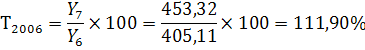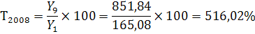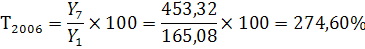 Как видно из рассчитанных данных, темп роста в целом положительный, но он не имеет выявленной тенденции, так как показатели по годам сильно отличаются друг от друга (например, показатель 2006 и 2007 годов отличаются друг от друга на 166,36%). Необходимо проводить анализ более точными методами, для выявления закономерностей изменения денежной выручки. б) Базисный . Определяется как отношение каждого последующего уровня изменения к начальному, который принимается за базу сравнения и умножается на сто.