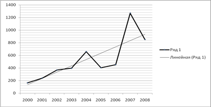 Рисунок 1 – Цена реализации 1 ц подсолнечника за 2000 – 2008 годы в СХА "Заря" Павловского района Воронежской области, рублей Приложение 2