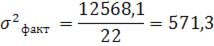 Woбщ. - общая вариация наблюдаемых значений (вариант), характеризуется разбросом вариант от общего среднего. Измеряет вариацию признака во всей совокупности под влиянием всех факторов, обусловивших эту вариацию. Общее разнообразие складывается из межгруппового и внутригруппового; Wфакт - факторная (межгрупповая) вариация, характеризуется различием средних в каждой группе и зависит от влияния исследуемого фактора, по которому дифференцируется каждая группа. Dост. - остаточная (внутригрупповая) вариация, которая характеризует рассеяние вариант внутри групп. Отражает случайную вариацию, т.е. часть вариации, происходящую под влиянием неуточненных факторов и не зависящую от признака — фактора, положенного в основание группировки. Вариация изучаемого признака зависит от силы влияния каких-то неучтенных случайных факторов, как от организованных (заданных исследователем), так и от случайных (неизвестных) факторов. Поэтому общая вариация (дисперсия) слагается из вариации, вызванной организованными (заданными) факторами, называемыми факториальной вариацией и неорганизованными факторами, т.е. остаточной вариацией (случайной, неизвестной). По данным, представленным в таблице 15 определим общую вариацию(